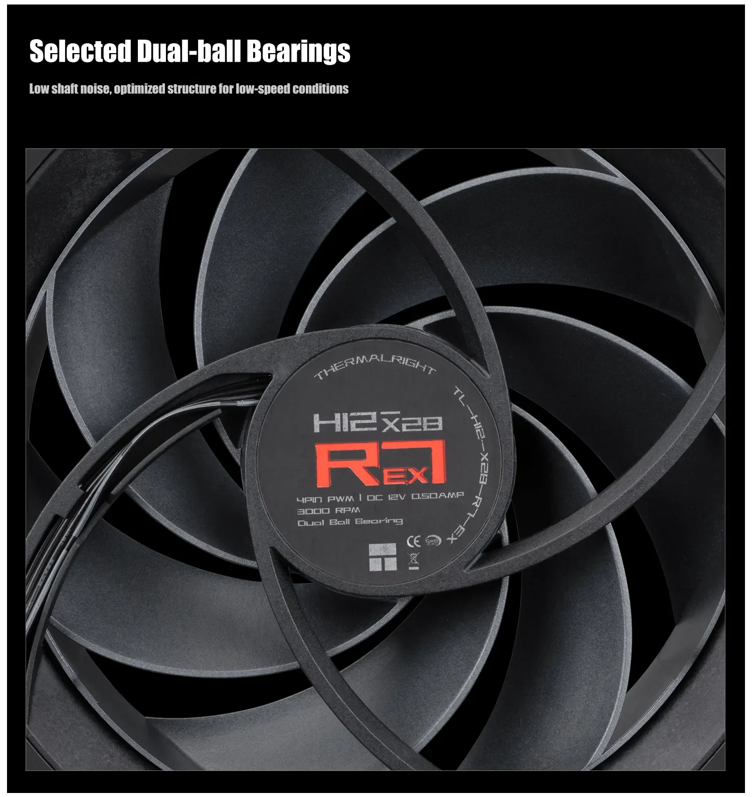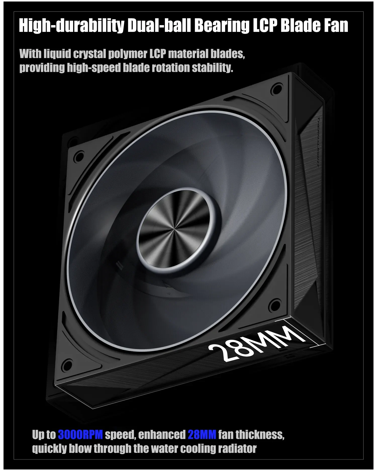 高耐久のLCPブレード・デュアルボールベアリングファン厚さ28mm、最大3000RPM(PWM対応)、4.2mmH2O