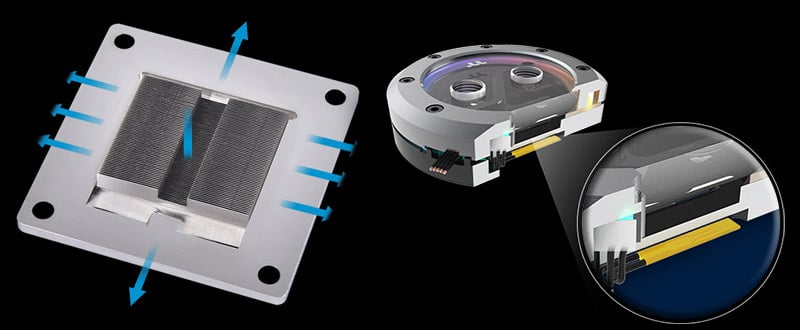 鏡面仕上げのニッケルめっき加工を施した銅ベースを採用しており、CPUとの接地面を最適化し高い熱伝達性と耐食性を実現。内部に0.2mmのマイクロフィン構造を採用することにより、冷却効率を高めています。
