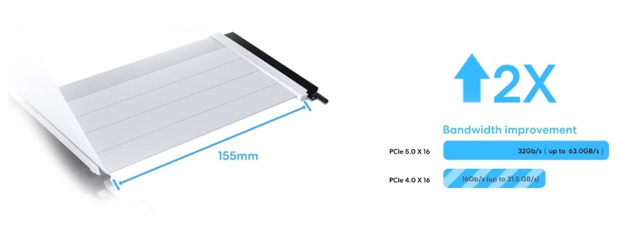 155mm の PCIe 5.0 ライザーケーブルは、最大 32Gb/s の帯域幅を提供し、PCIe 4.0 の 2 倍の速度を実現します。