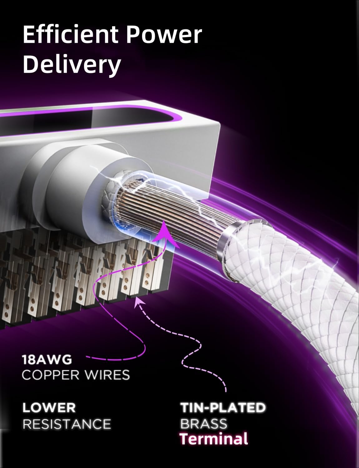 18AWG 純銅線コアと真鍮スズメッキ端子 (高電圧および高温耐性) を備え、抵抗を低減します。電流損失を最小限に抑え、ブルー スクリーンを防止します。