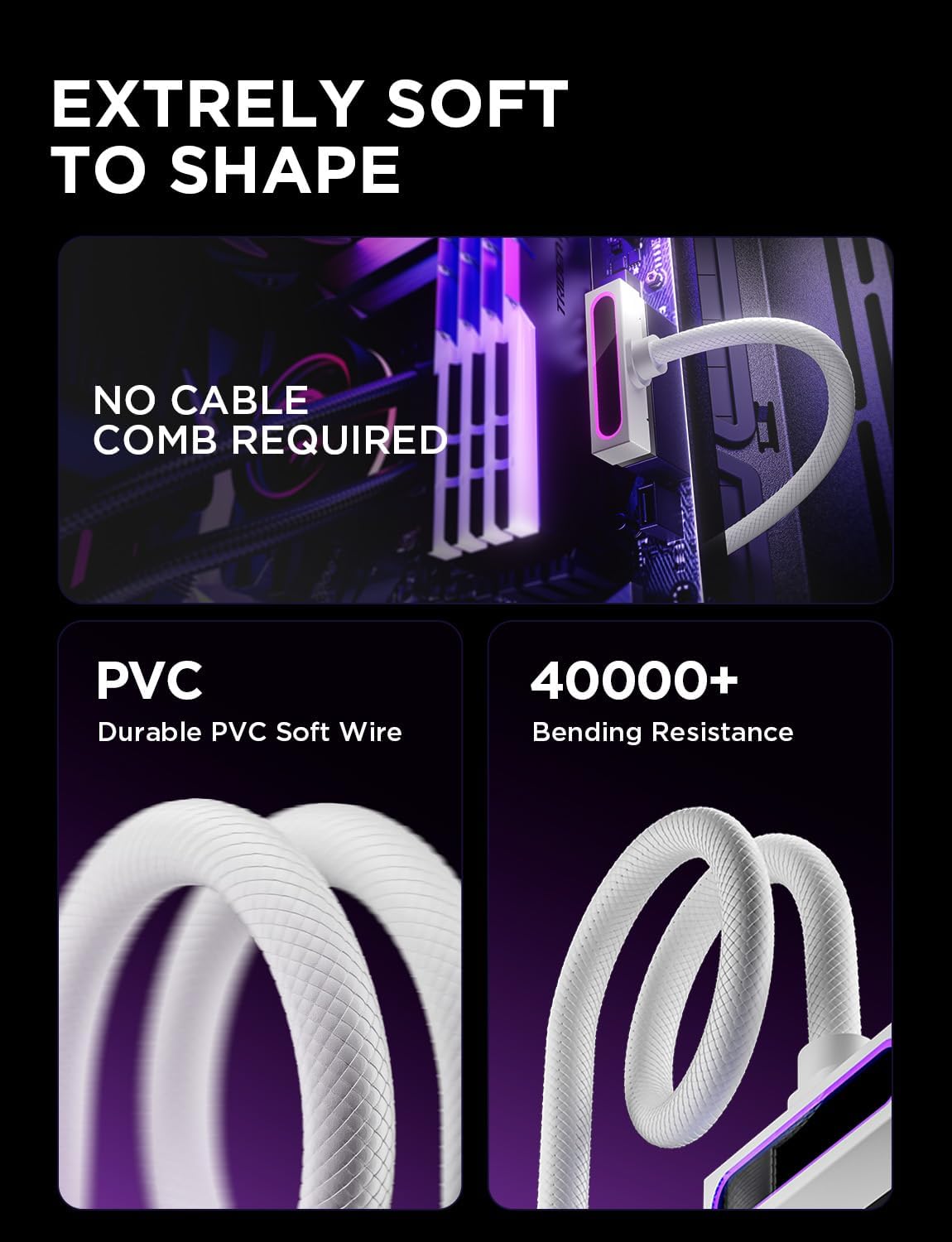 簡単に曲げられるほど柔軟で、長持ちする PVC ソフト素材で作られています。ケーブルコームなしでも 40,000 回以上の折り曲げに耐え、長期にわたる信頼性を保証します。