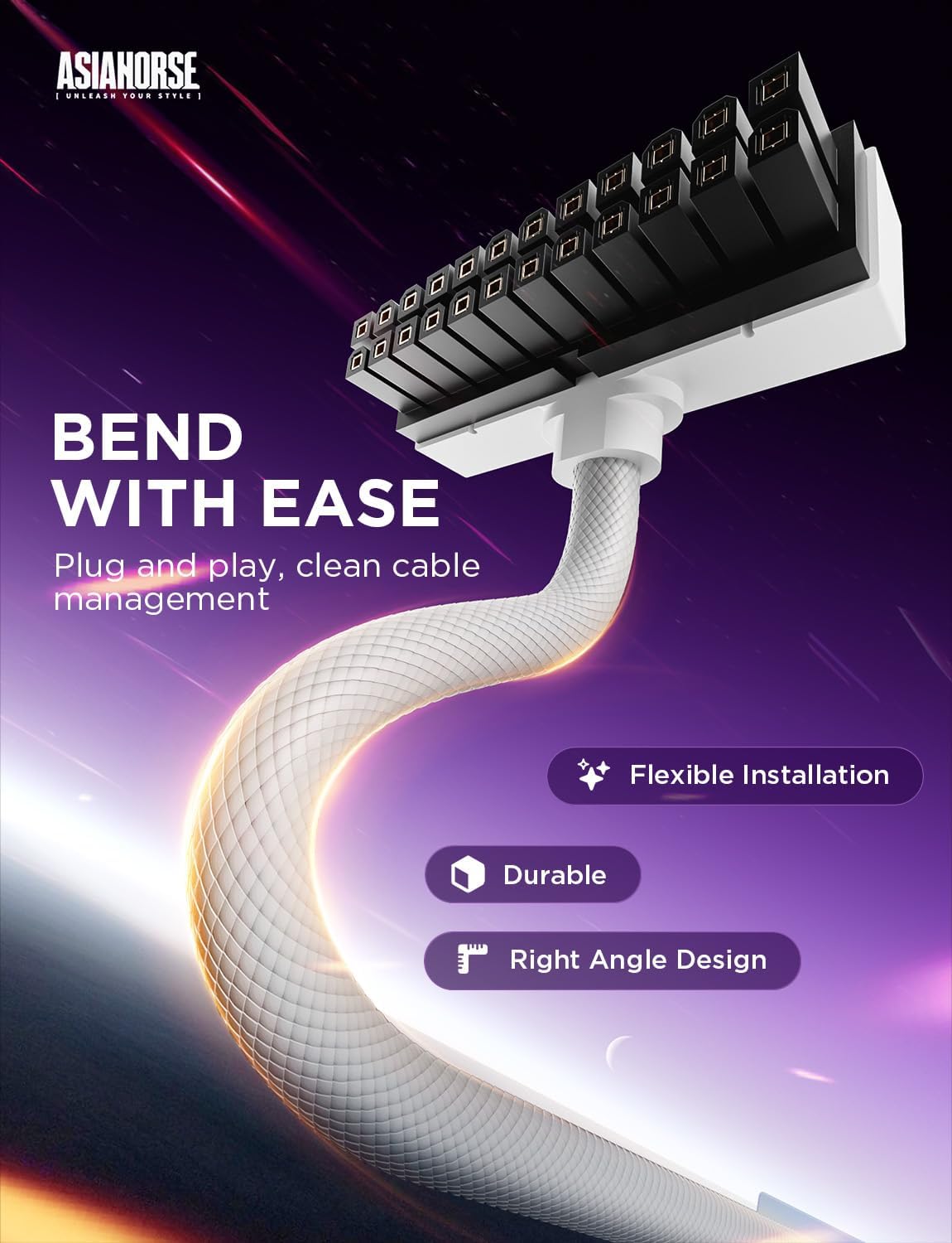 シームレスなスタイルと 90° 直角コネクタを使用して設計されています。曲げる必要がなく、完全な端子接触を保証します。プラグ アンド プレイのセットアップにより柔軟性が向上し、ケーブル管理がきれいになるため、PC DIY ビルドに最適です。