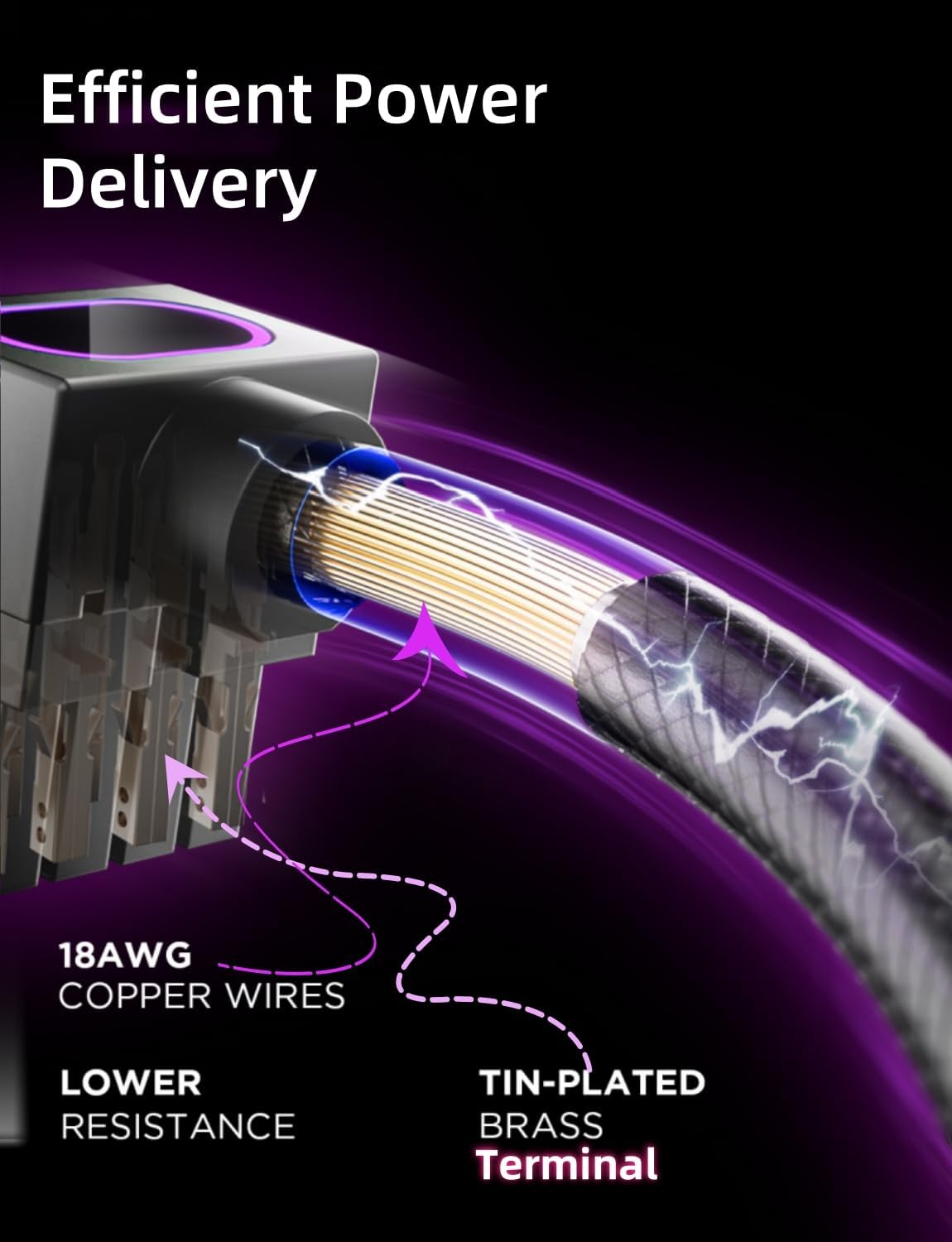 18AWG 純銅線コアと真鍮スズメッキ端子 (高電圧および高温耐性) を備え、抵抗を低減します。