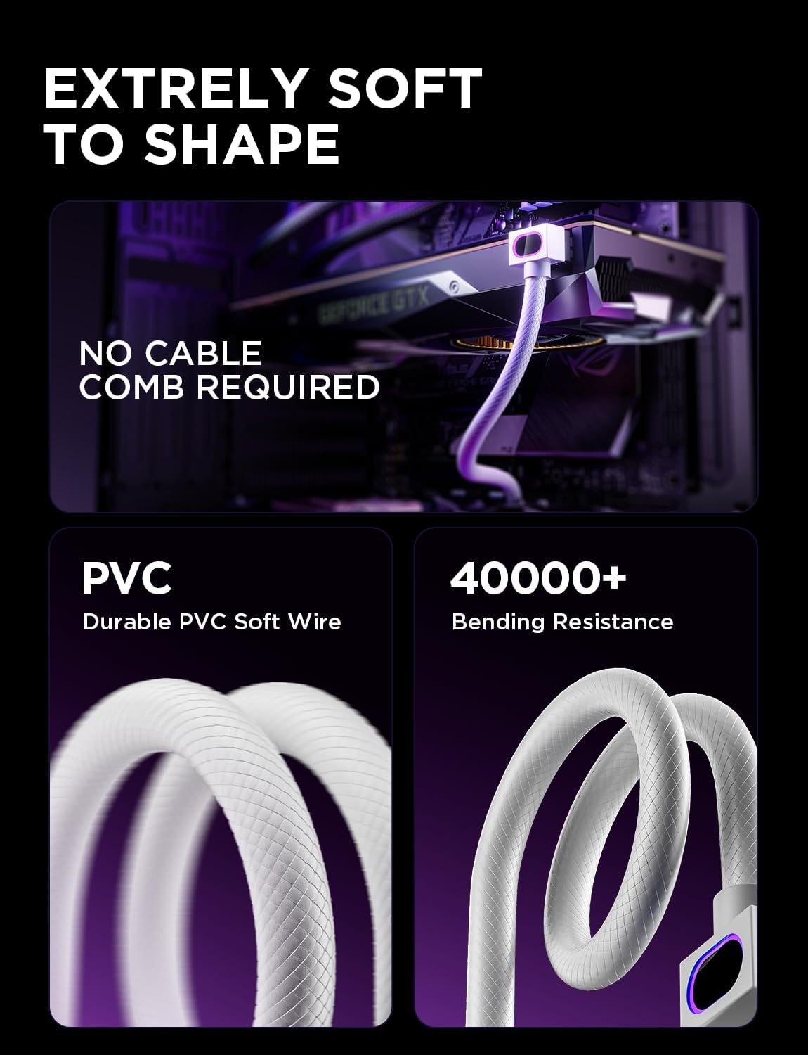 簡単に曲げられるほど柔軟で、長持ちする PVC ソフト素材で作られています。ケーブルコームなしでも 40,000 回以上の折り曲げに耐え、長期にわたる信頼性を保証します。