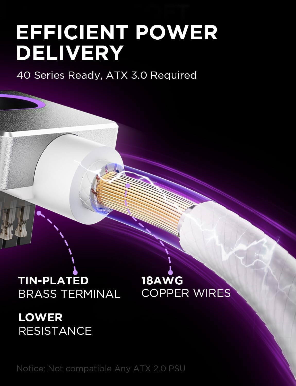 18AWG 純銅線コアと真鍮スズメッキ端子 (高電圧および高温耐性) を備え、抵抗を低減します。16PIN モジュラー ケーブルは最大 530W の入力をサポートし、電流損失を最小限に抑え、ブルースクリーンを防止します。