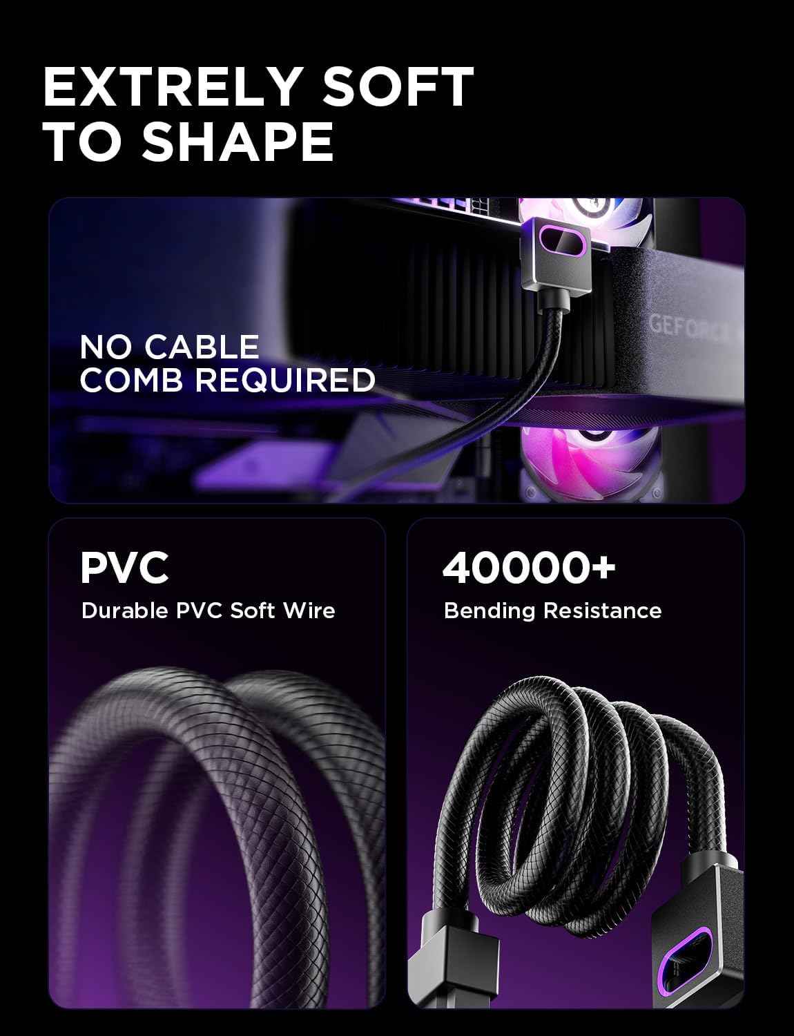 シームレスなスタイルと 90° 直角コネクタを使用して設計されています。曲げる必要がなく、完全な端子接触を保証します。プラグ アンド プレイのセットアップにより柔軟性が向上し、ケーブル管理がきれいになるため、PC DIY ビルドに最適です。