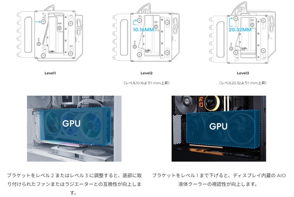 VGブラケットは3つの取り付け高さを持ち、それぞれ10.16mm単位で10.16mmずつ調整可能で、GPUの正確な位置調整が可能で、下部ファンや大型CPUクーラーのスペースも容易に確保できます。
