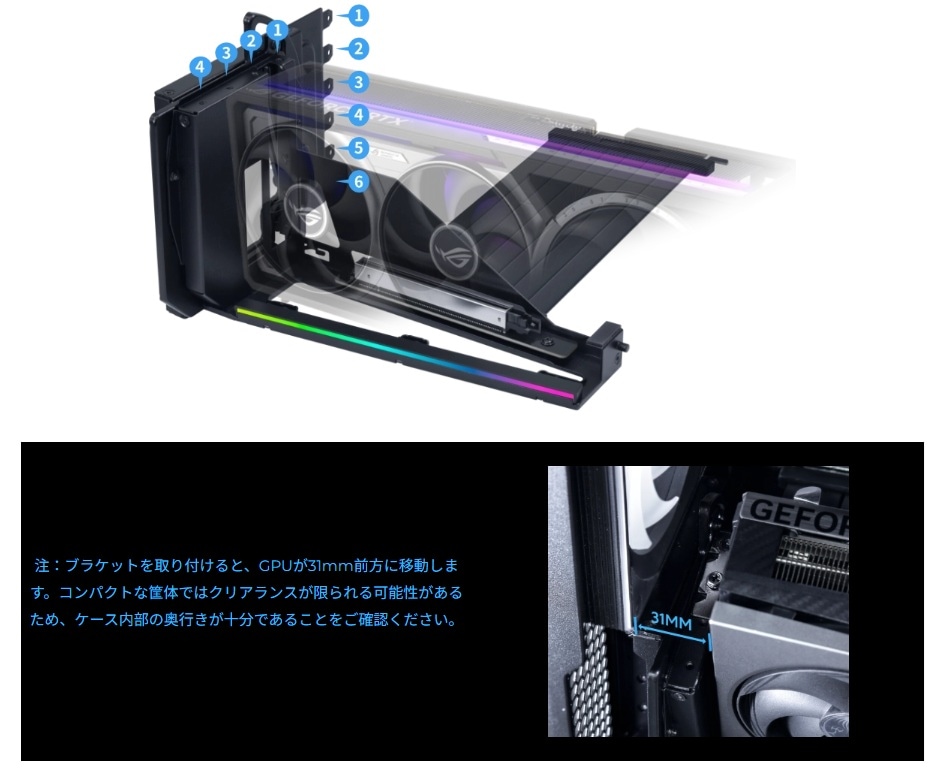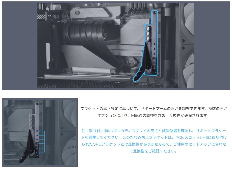 ・GPUのたわみ防止のために最大10kgまで強化されたサポートアーム
