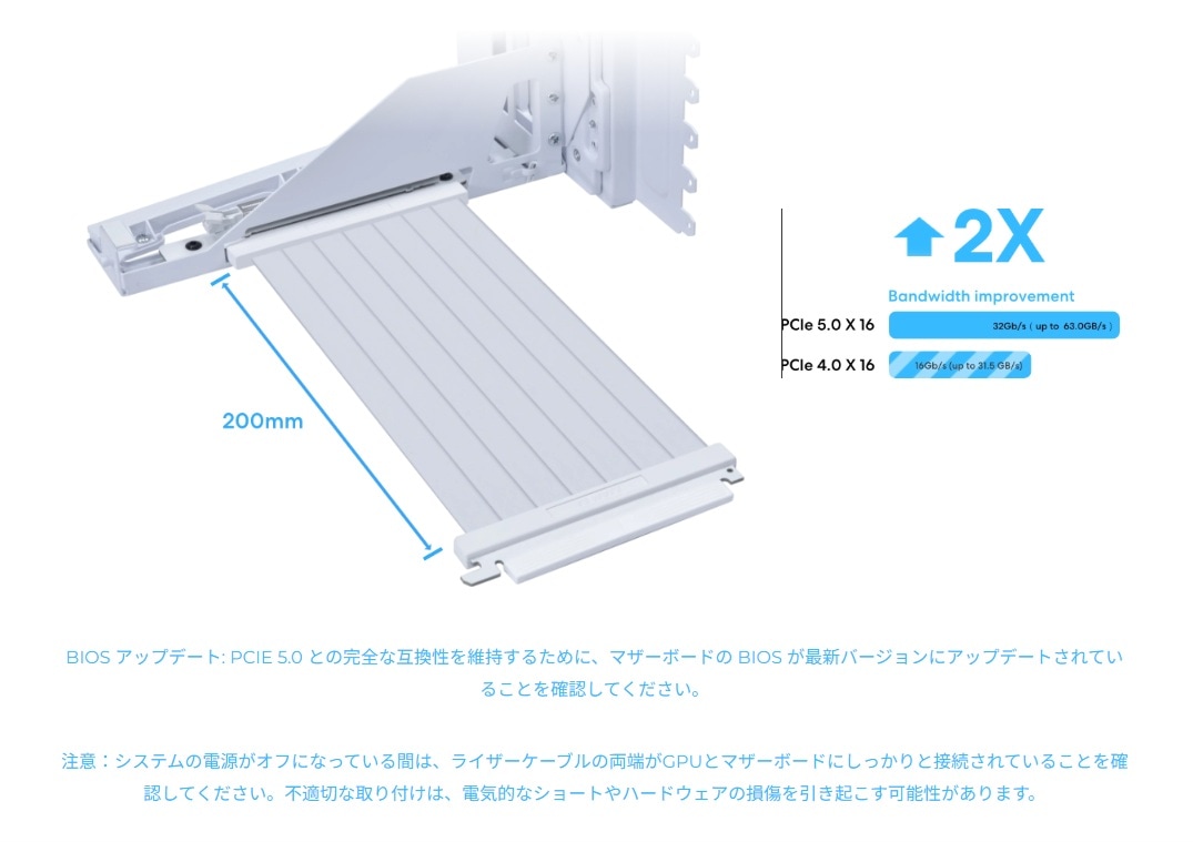・200mm PCIe 5.0ライザーケーブルで最大32Gb/sの帯域幅