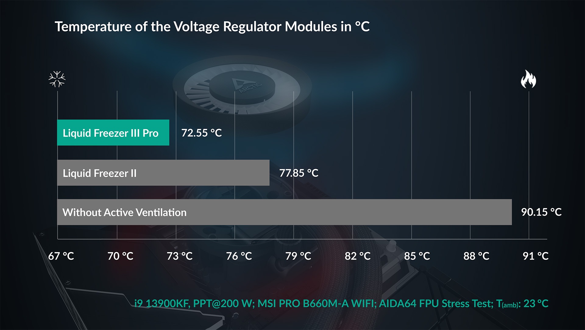 38mm厚ラジエーターは放熱性を高めるだけでなく、従来の27mmラジエーターよりも多くの液体を保持できます。これにより熱の蓄積が抑えられ、温度上昇への対応がより効率的になります。