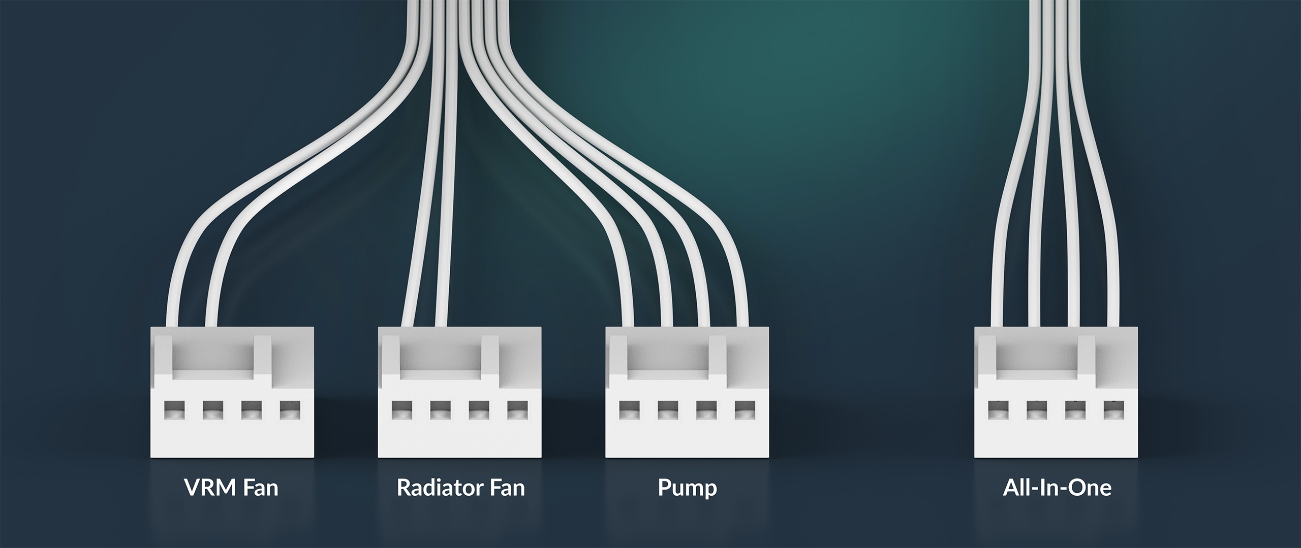 ■ 2つの制御オプションスプリッターケーブルを使用すると、ポンプ・VRMファン・ラジエーターファンを個別に制御したり、またはオールインワン ケーブルを使用して単一のPWM信号で同期したりすることができます。