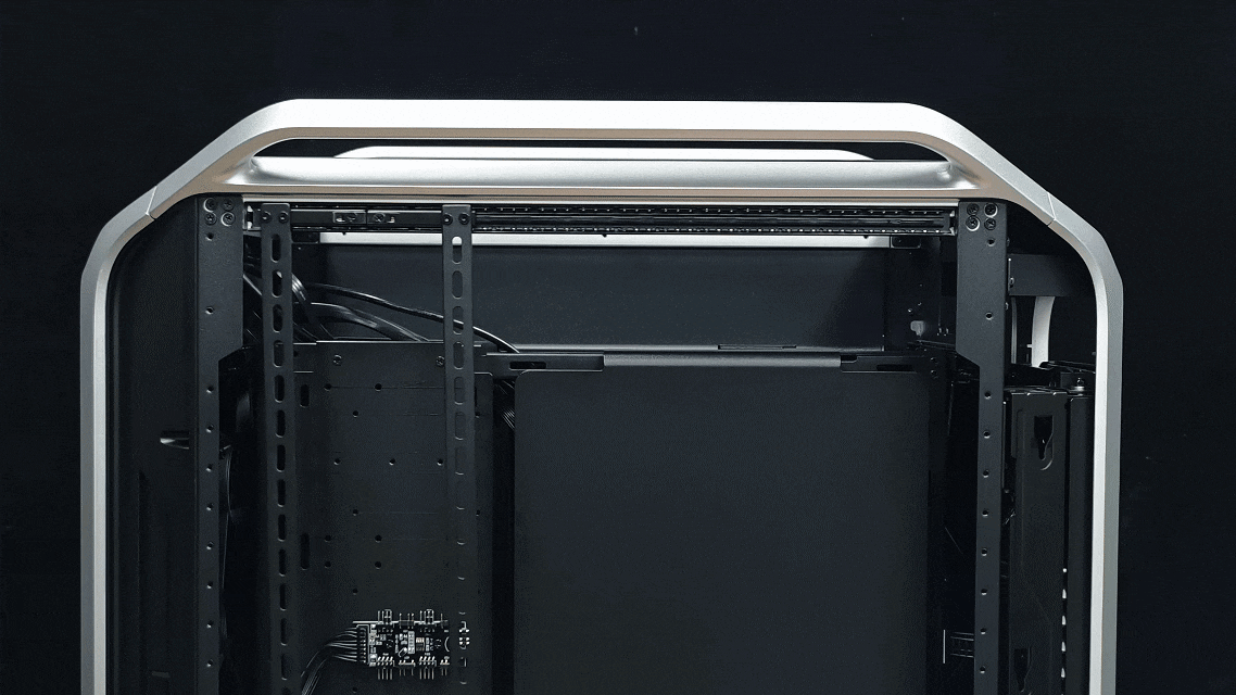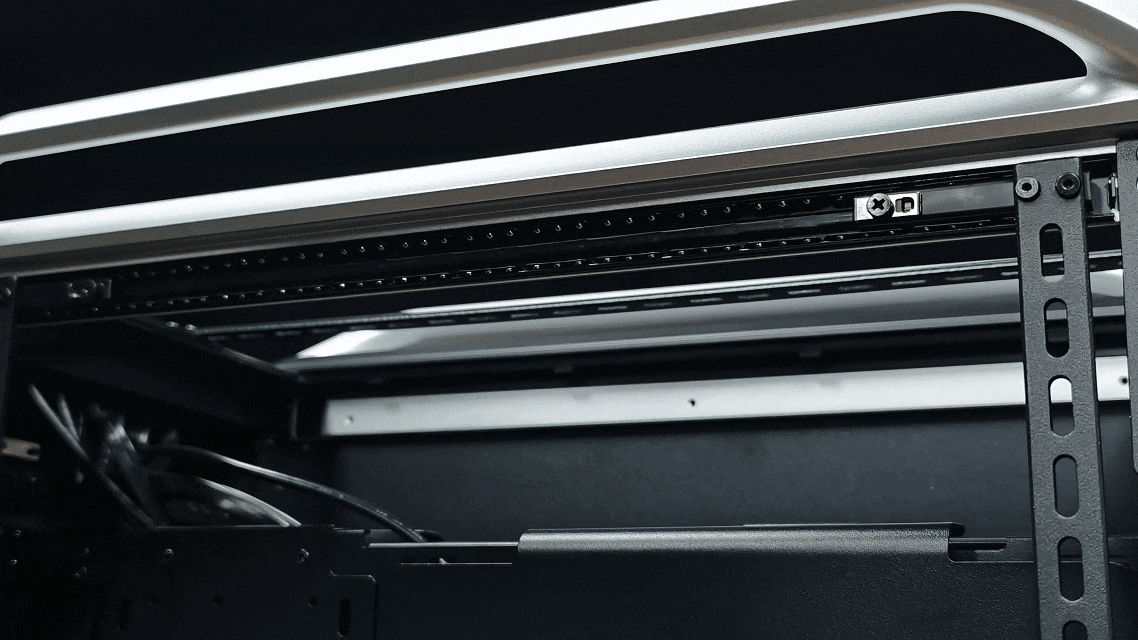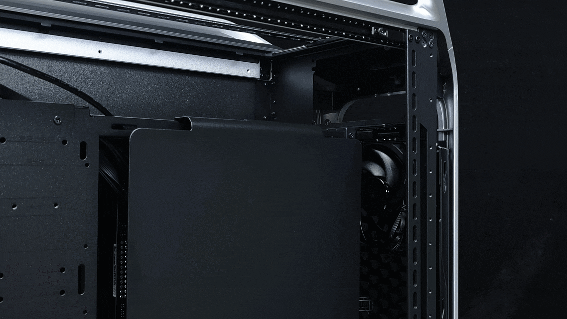 スライド式トレイ設計により、ケース内のスペースを解放し、空冷と水冷のレイアウトをシームレスに再構成できます。また、ビルダーはGPUとサイドパネルの距離を簡単に微調整できるため、エアフローを最適化したり、GPUを前面に出すことも可能です。