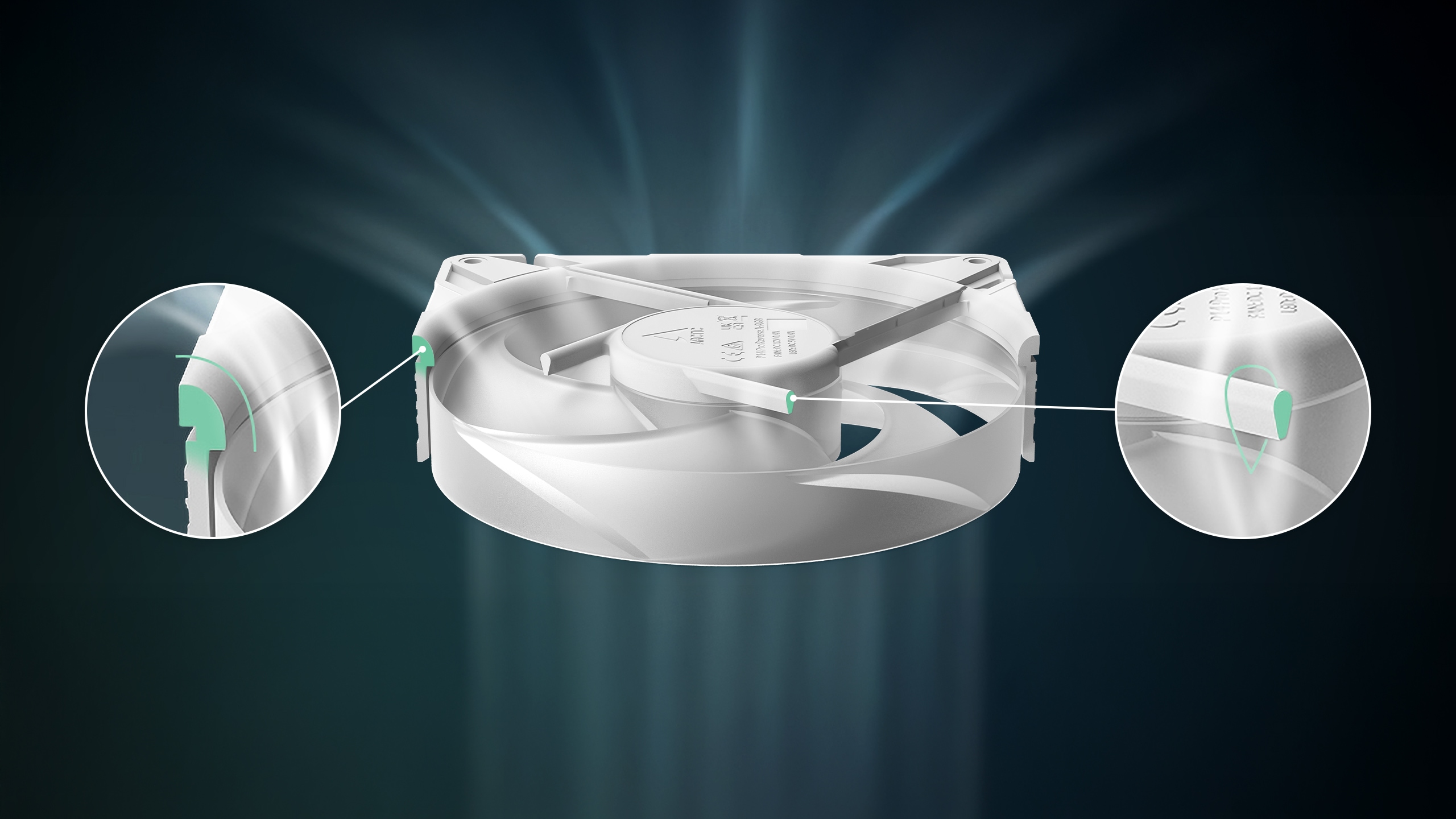 ■ 最適化されたエアフロー設計トランペット型のインテークとティアドロップ型のスポークが空気の流れを誘導し、損失を低減します。これにより空気抵抗が低減され、乱流と空力騒音が最小限に抑えられます。