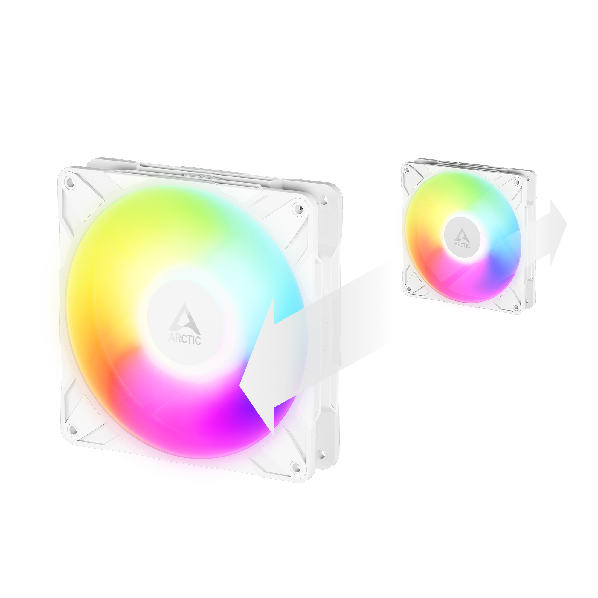 デイジーチェーン対応でラジエーター用に使用時も煩雑な配線が不要カラー: ホワイト、ARGB搭載 / ブレード反転(逆回転)モデル140x140x30mm / 400〜2,650 rpm / 98 CFM / 5.1 mmH2O