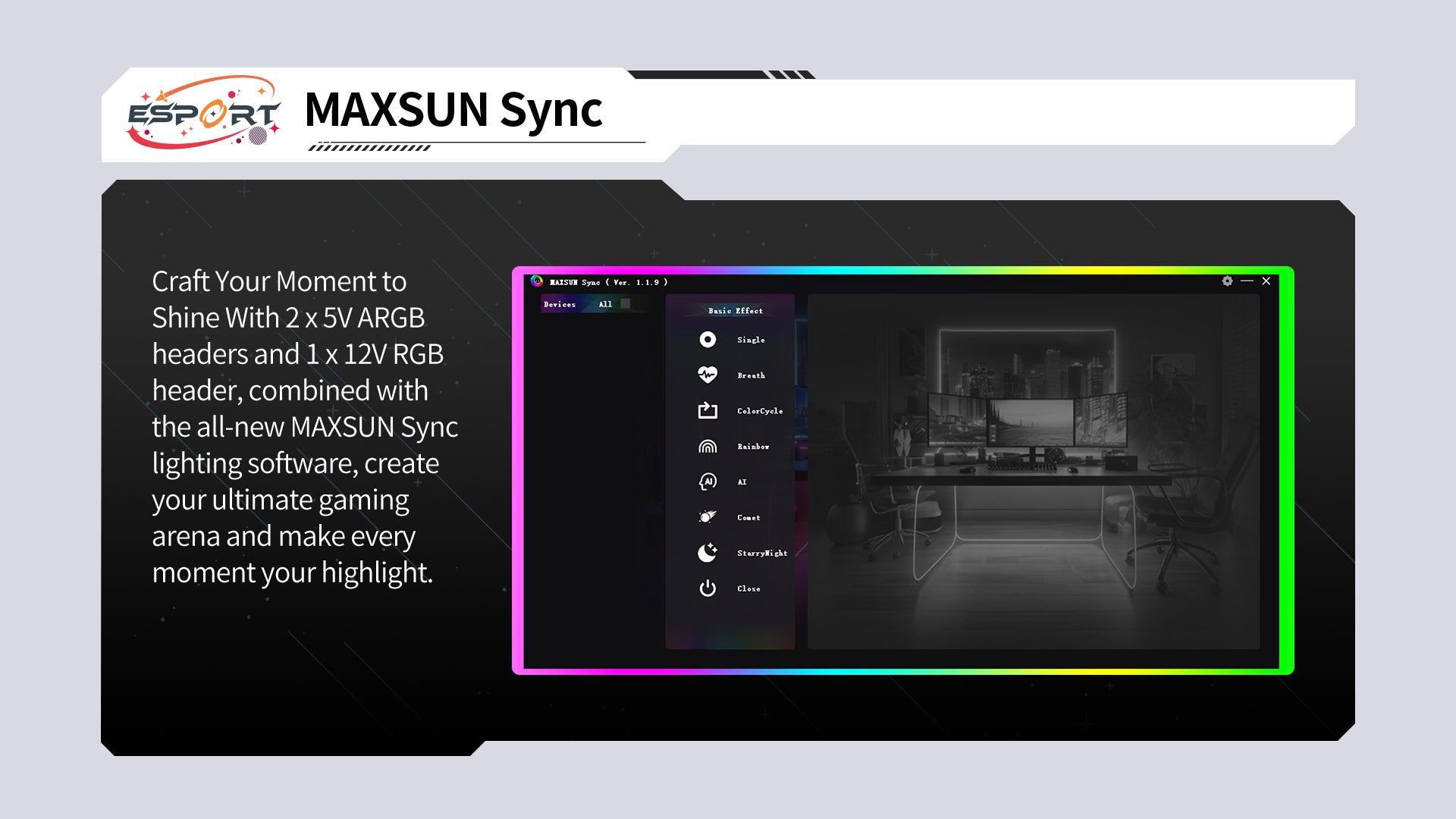 2x 5V ARGB headers, 1x 12V RGB header, supports Maxsun SYNC