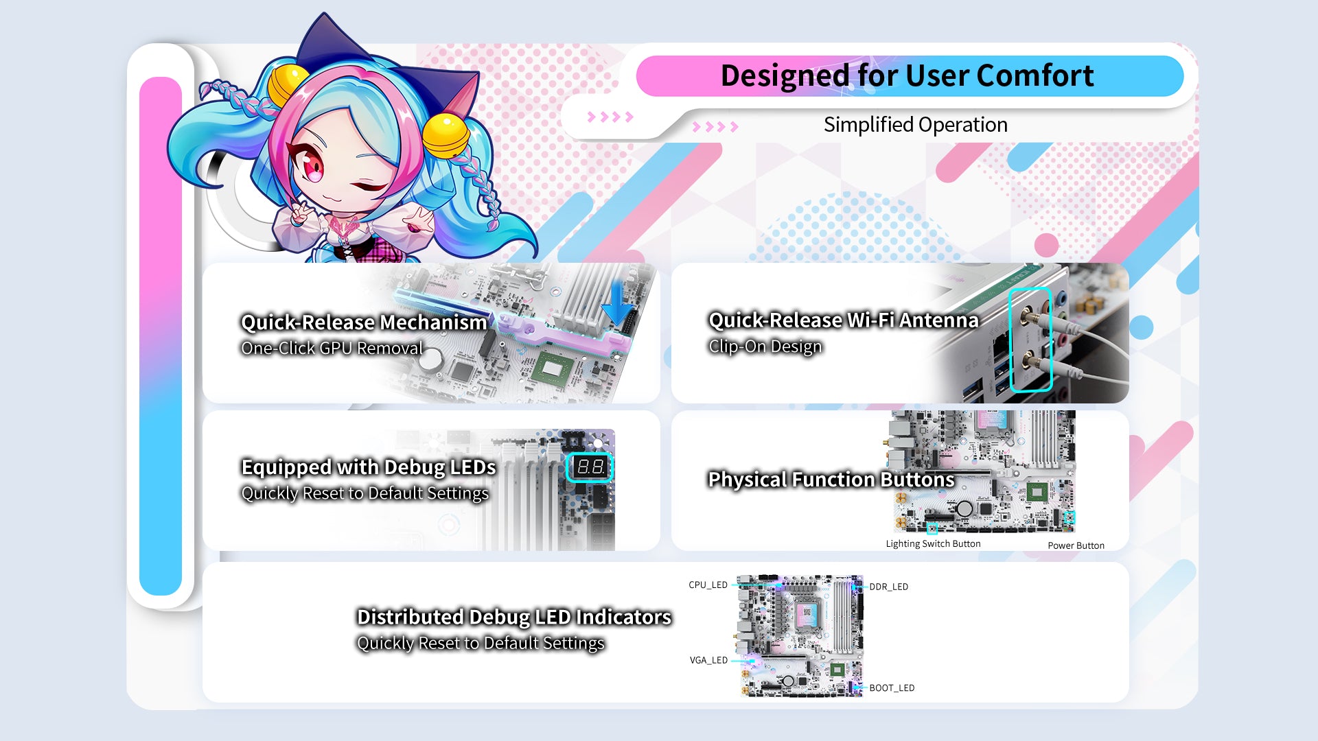 One-Click GPU Release / Debug Diagnostic LEDs / Quick-Mount Wi-Fi Antenna・整ったレイアウトとシンプルな操作体系のPTM UI BIOS