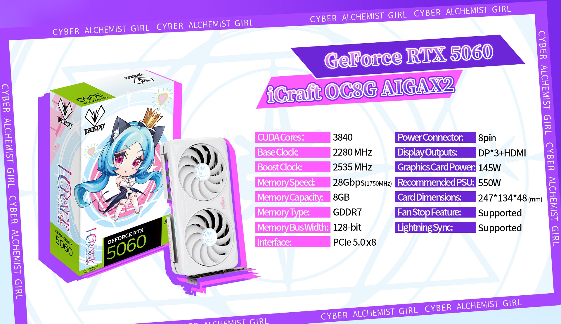 バックプレートにAIGA(エイジア)が描かれた可愛いデザインPCIe5.0 x16 / CUDAコア: 3840 / GPUクロック: 2,535MHz(Boost) / GDDR7メモリ: 8GB, 28Gbps, 128bit幅