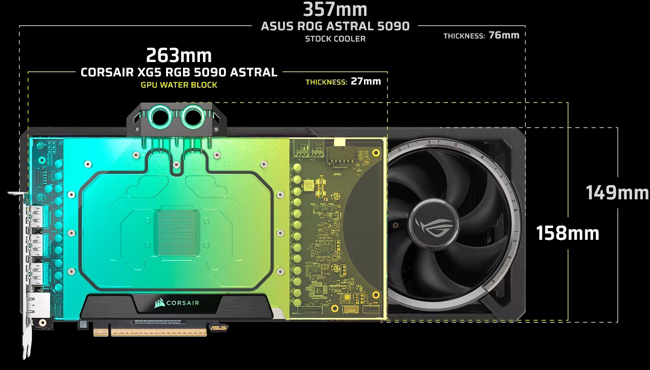 ASUS ROG Astral GeForce RTX™ 5090の純正クーラーと交換できるように設計されており、長さを27%、厚さを65%削減し、新しいグラフィックスカードのサイズを大幅に縮小します。